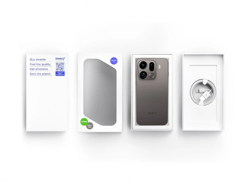 Każdy odnowiony smartfon OPPO dostarczany jest w kompletnym zestawie obejmującym urządzenie, niezbędne akcesoria, kartę gwarancyjną oraz certyfikat diagnostyczny. Całość zapakowana jest w solidne, ekologiczne opakowanie Soft-touch, które chroni sprzęt podczas transportu i zapewnia estetyczne pierwsze wrażenie. Kod QR na opakowaniu umożliwia szybki dostęp do informacji o stanie urządzenia i przeprowadzonych testach.